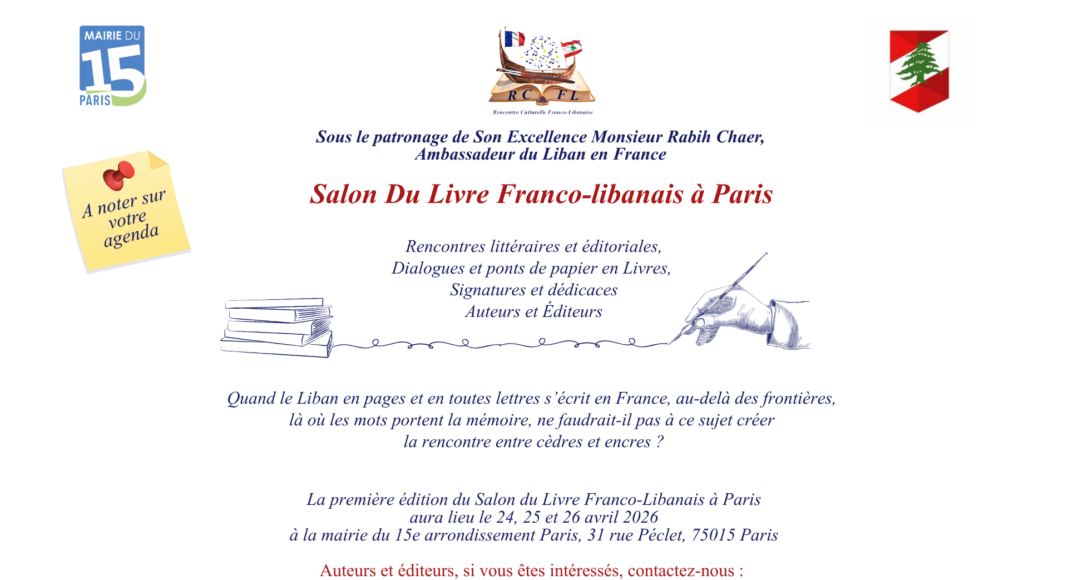 Ce Salon du Livre qui sera organisé à la mairie du 15e arrondissement de Paris, les 24, 25 et 26 avril 2026, est né d’une conviction profonde : le livre est l’un des plus puissants vecteurs de dialogue entre les peuples, les cultures et les mémoires. Il se veut une rencontre littéraire dédiée à la richesse des échanges entre la France et le Liban à travers le livre ; écrivains, éditeurs et lecteurs réunis autour du Liban.