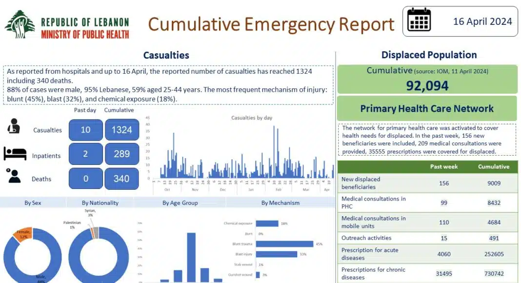 Le Ministère de la Santé Publique de la République du Liban a publié un rapport cumulatif d’urgence qui détaille la situation préoccupante en date du 16 avril 2024. Le rapport documente un total de 1 324 victimes signalées par les hôpitaux jusqu’à la date du rapport, avec un bilan tragique de 340 décès. Une grande majorité des cas, soit 88 %, étaient de sexe masculin, et la nationalité prédominante des personnes affectées était libanaise, représentant 95 % des cas. Le groupe d’âge le plus touché est celui des 25 à 44 ans, qui constitue 59 % du total des victimes.