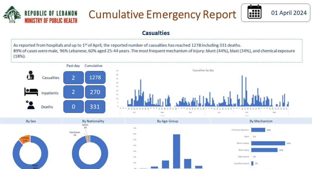 Le Ministère de la Santé Publique a publié un rapport cumulatif d’urgence daté du 1er avril 2024, révélant des statistiques alarmantes sur les incidents ayant entraîné des blessures ou des décès au sein de la population suite aux combats avec Tsahal au Sud du Liban. Selon les données collectées par les hôpitaux jusqu’au 1er avril, le nombre de victimes a atteint 1278, dont 331 décès. Ces chiffres, illustrant une réalité sombre, soulignent la gravité de la situation sécuritaire et sanitaire à laquelle le pays est confronté.