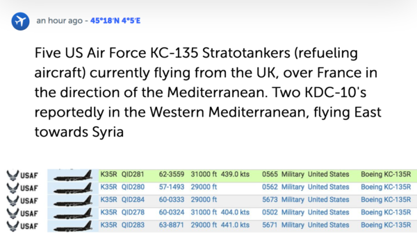 Par ailleurs, il semblerait que plusieurs avions ravitailleurs américains se déploient sur la zone, un préalable nécessaire pour mener des attaques aériennes.