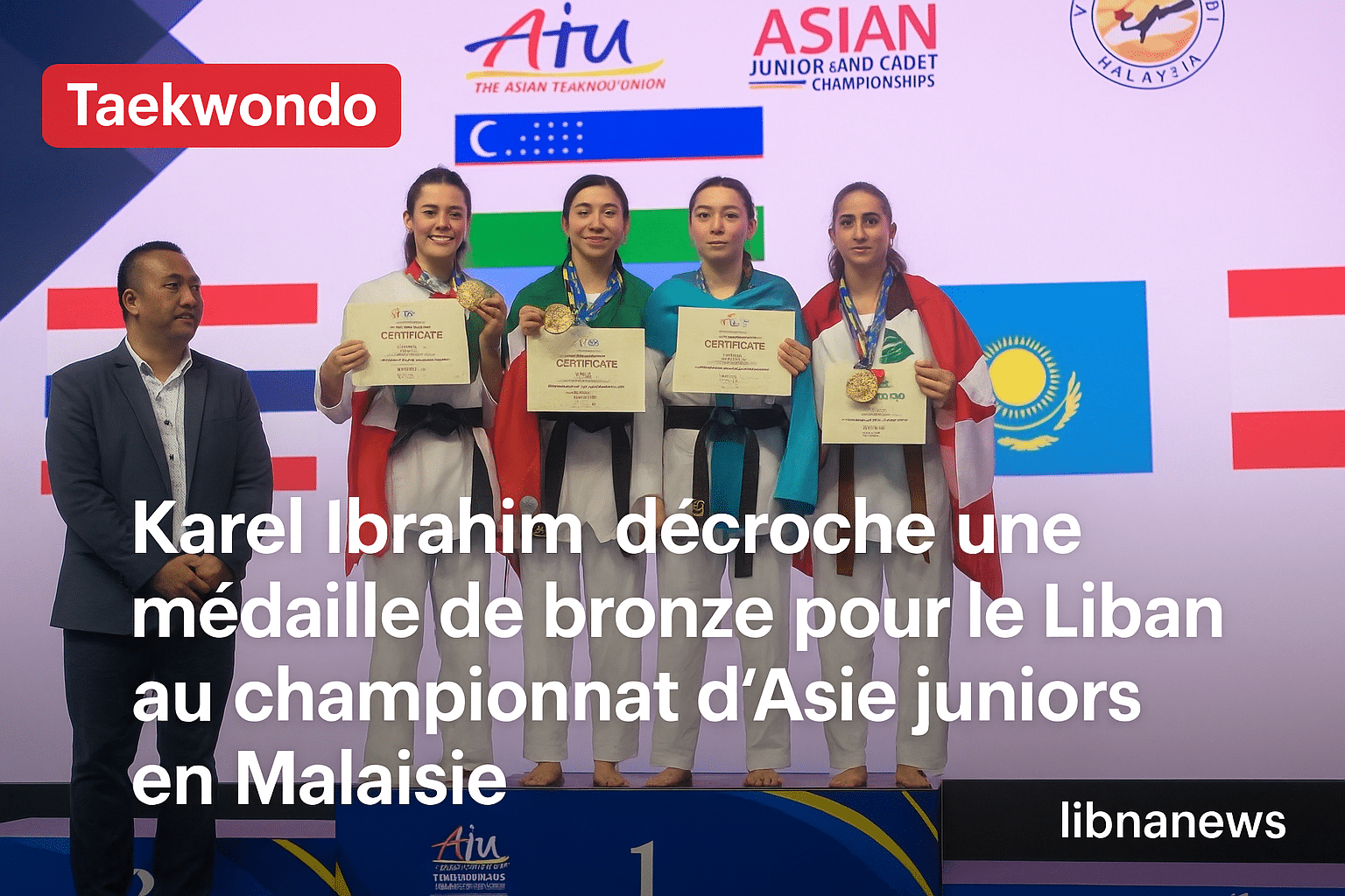 Karel Ibrahim a hissé les couleurs du Liban sur le podium continental après un parcours exigeant face à une concurrence relevée. Elle a affronté des adversaires issues de pays traditionnellement bien classés dans les compétitions asiatiques, démontrant tout au long de son parcours une maîtrise technique remarquable. En accédant à la demi-finale, elle a sécurisé une médaille de bronze méritée. La photographie de la cérémonie, prise sur le podium officiel de l’événement, la montre en compagnie des autres médaillées, tenant son certificat et arborant fièrement le drapeau libanais.