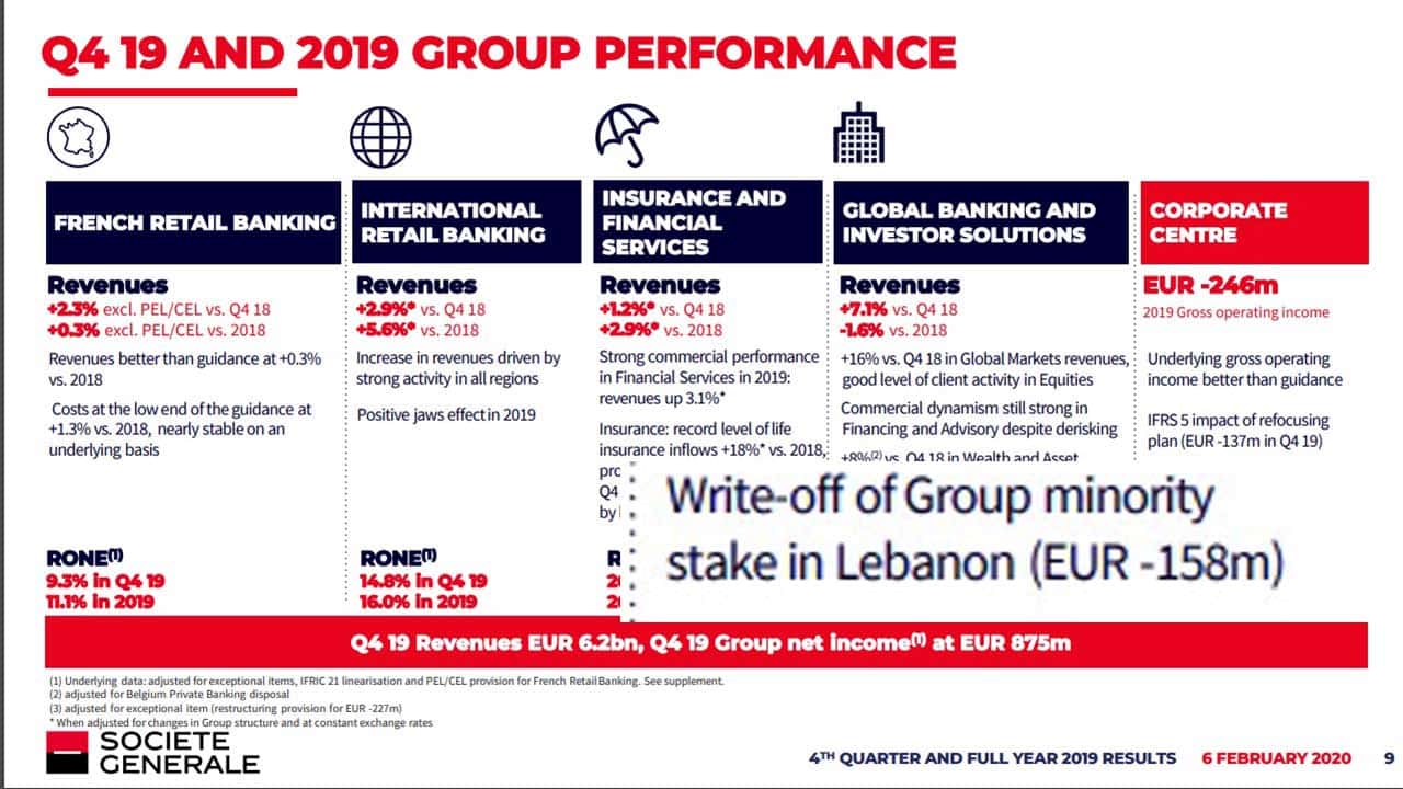 La Société Générale a effectué une dépréciation de la valeur totale de sa participation dans le capital de Société Générale de Banque au Liban...