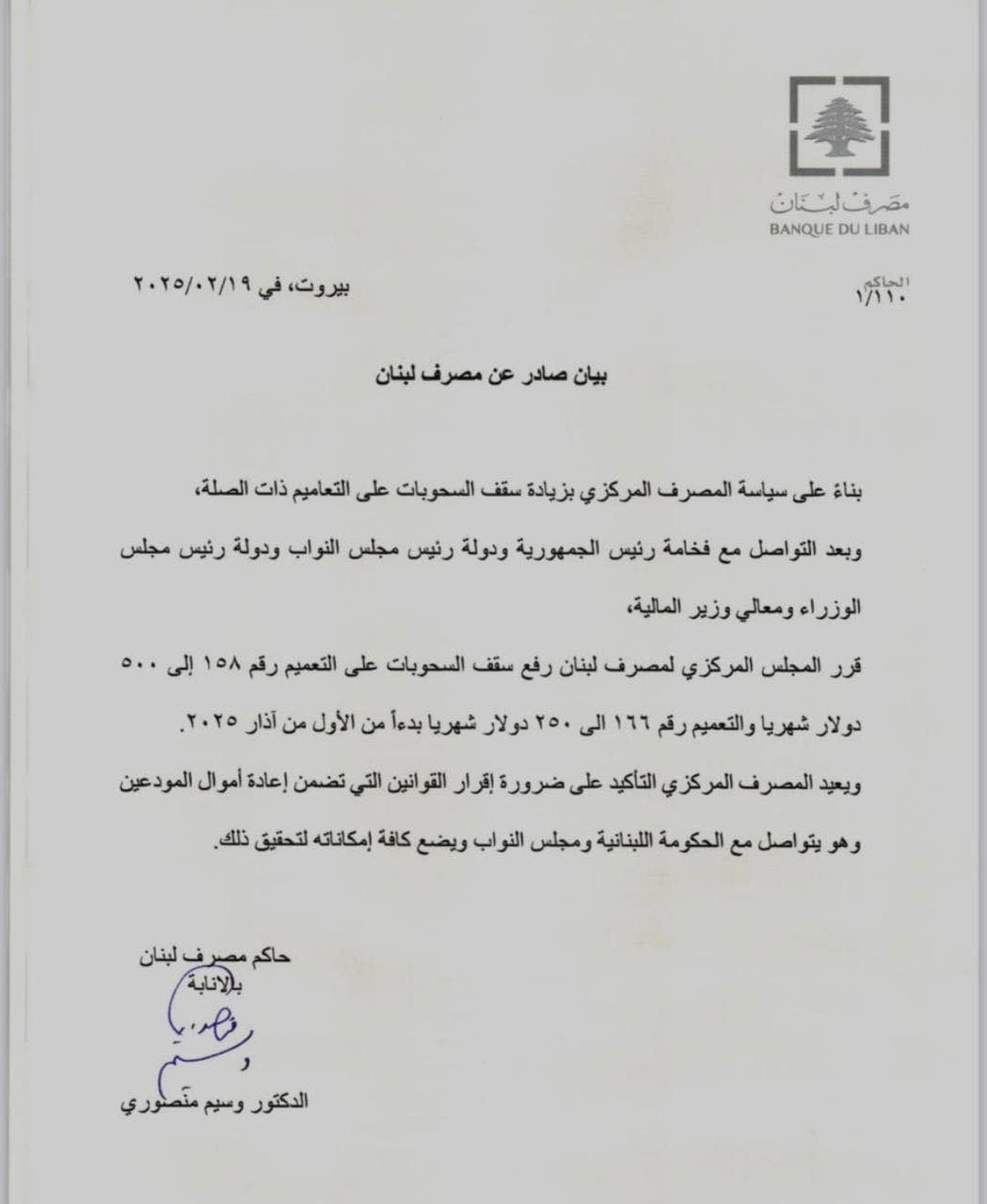 la Banque du Liban augmente le plafond des retraits en dollars à 250 dollars...