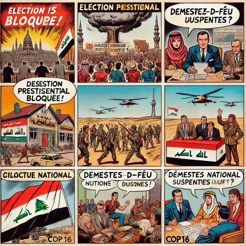 Cette planche BD en style années 1950 illustre les grands enjeux du 15 décembre 2024 au Moyen-Orient : le blocage politique au Liban, la crise des réfugiés en Europe, les discussions sur le climat à la COP16, et les tensions en Irak et à Gaza. Les illustrations capturent également des initiatives comme la reconstruction en Syrie, l’aide humanitaire au Yémen, et le rôle de l’art dans un contexte de crise. Une vision graphique et percutante de l’actualité.