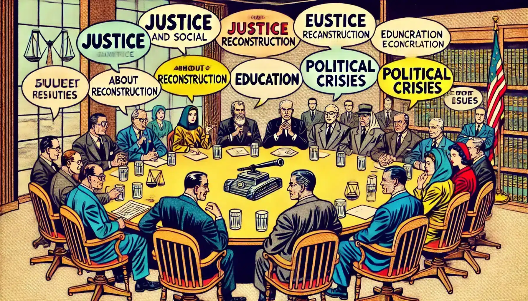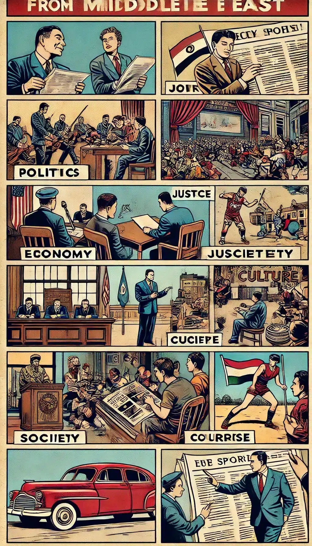 Cette planche illustrée vintage des années 1950 capture en 10 cases les actualités majeures du Liban et de la Syrie. Débats politiques, crises économiques, blocages judiciaires, tensions sociales, et expressions culturelles se mêlent dans un format visuel unique, reflétant la complexité de cette région en mutation. Chaque vignette résume un aspect clé de l’actualité, offrant un regard à la fois rétrospectif et immersif sur les enjeux contemporains.