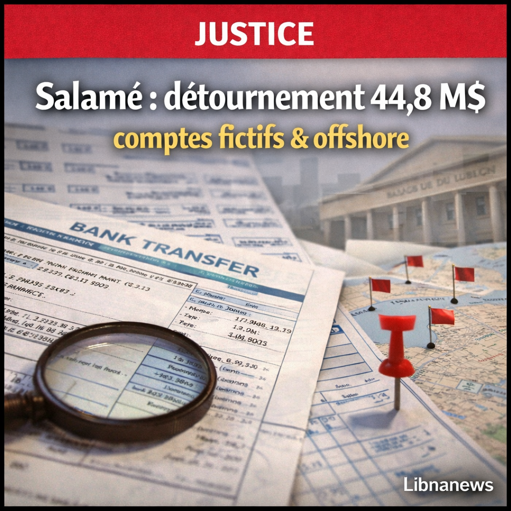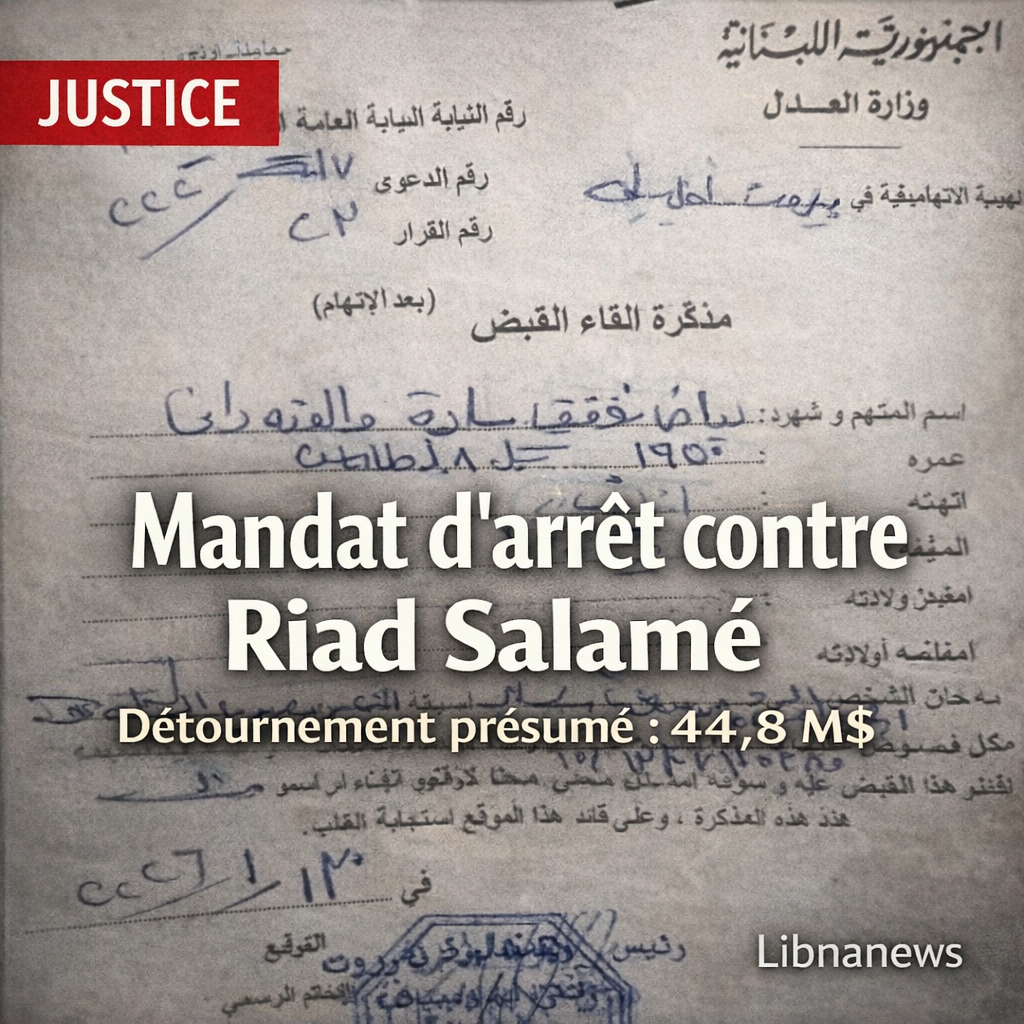 La chambre d’accusation de Beyrouth a inculpé Riad Salamé et émis un mandat d’arrêt pour détournement de 44,8 millions de dollars, falsification et enrichissement illicite. Selon l’enquête, des fonds de la Banque du Liban auraient transité via Michel Tueni, avec l’appui de Marwan Issa al-Khoury.