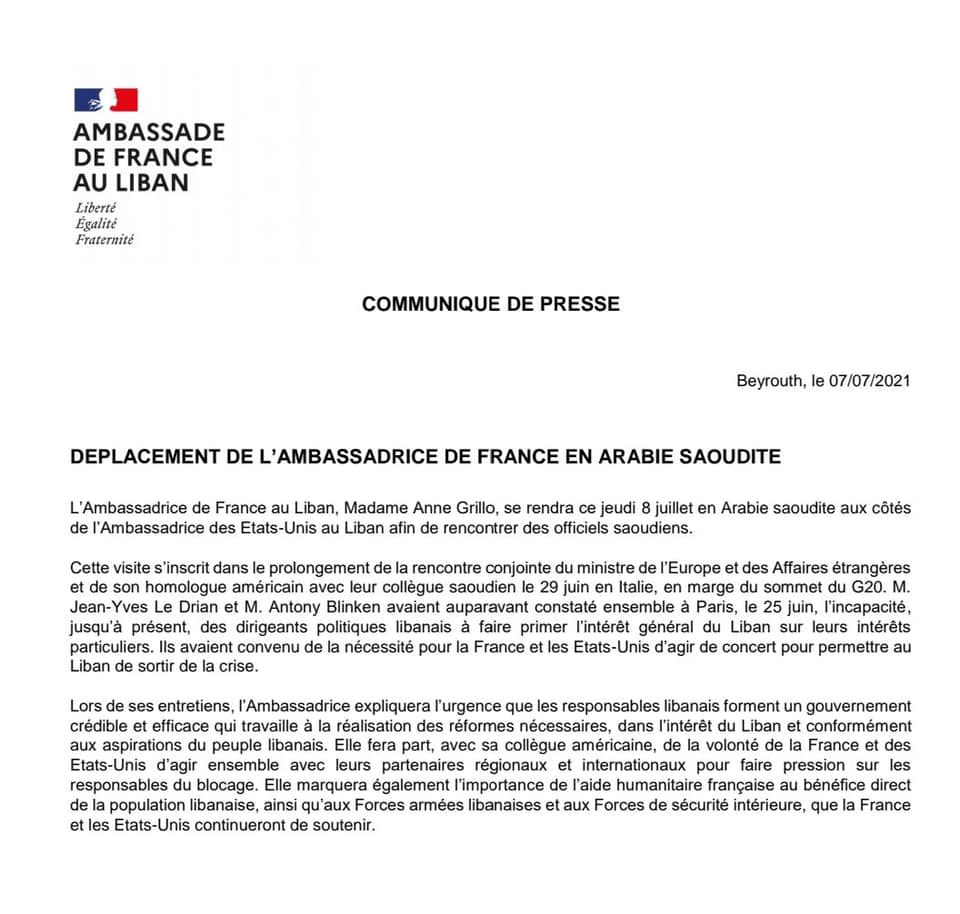 أعلنت سفارتا الولايات المتحدة وفرنسا الزيارة المشتركة للسفيرين دوروثي شيا وآن جريللو إلى المملكة العربية السعودية في 8 تموز / يوليو.