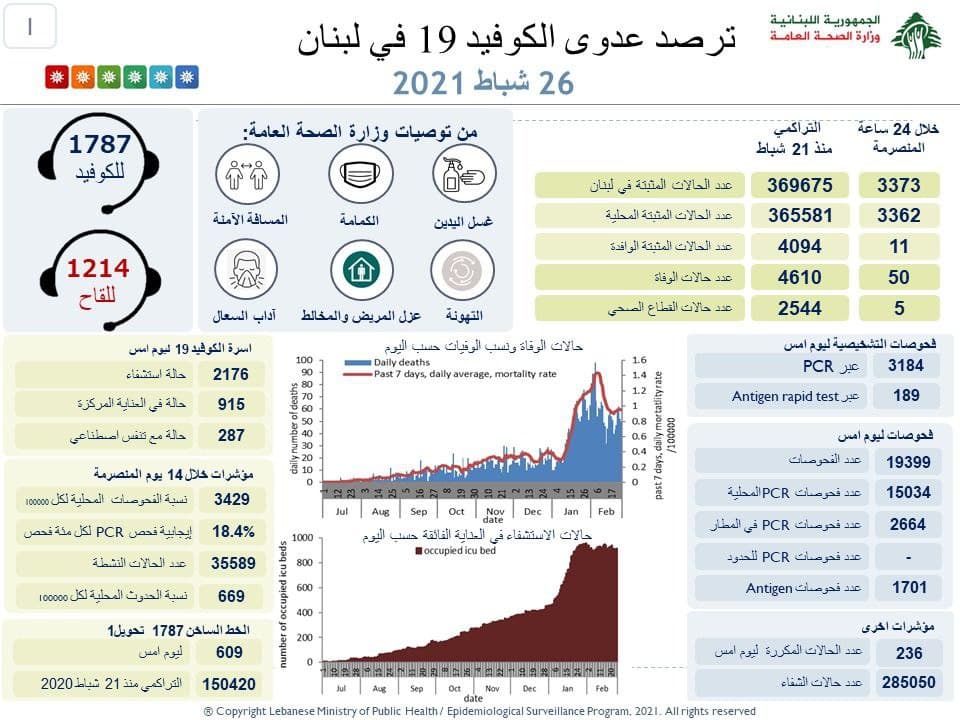 Le Liban déplore 50 décès et 3 373 nouveaux cas de personnes contaminées par le coronavirus COVID19 ces dernières 24 heures.