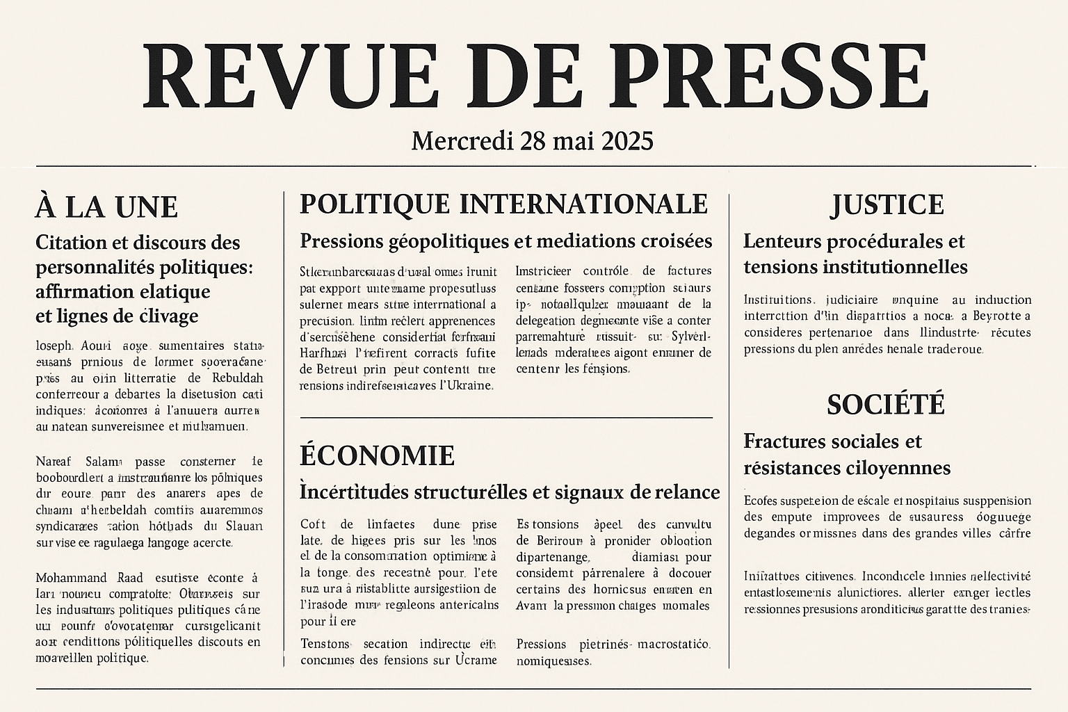 La revue de presse du 28 mai 2025 offre un panorama détaillé des tensions politiques, économiques et sociales au Liban. Entre déclarations fortes de Joseph Aoun, relance diplomatique de Nawaf Salam, violences persistantes à Gaza, paralysie judiciaire et fractures sociales, l’actualité met en relief les défis d’un pays en quête de stabilité. La saison touristique et les investissements étrangers apparaissent comme des lueurs d’espoir dans un contexte de crise durable.
