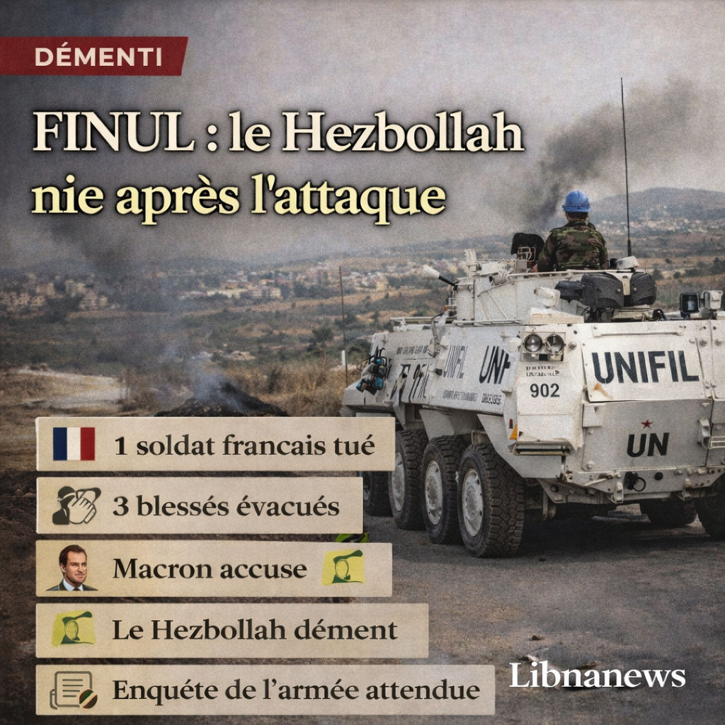 Le Hezbollah a démenti toute implication dans l’attaque qui a coûté la vie à un militaire français de la FINUL dans le sud du Liban. Ce démenti, publié par l’Agence nationale d’information, intervient après les accusations d’Emmanuel Macron et alors que les autorités libanaises ont multiplié les condamnations. Joseph Aoun a assuré que les responsables seraient poursuivis, tandis que Nabih Berri a dénoncé l’attaque et présenté ses condoléances. L’enquête militaire libanaise devient désormais le point central d’une affaire à la fois sécuritaire, diplomatique et politique