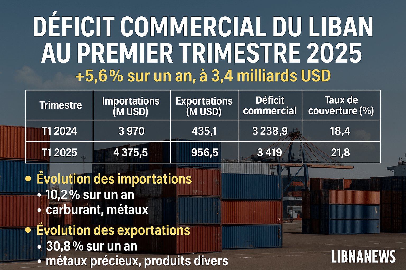Le déficit commercial du Liban a atteint 3,4 milliards USD au premier trimestre 2025, en hausse de 5,6 % sur un an. Les importations ont progressé de 10,2 %, tirées par l’énergie et les métaux. Les exportations ont crû de 30,8 %, portées par les métaux précieux et certains produits industriels. Le taux de couverture s’est amélioré à 21,8 %, mais reste insuffisant pour contenir la dynamique déficitaire.