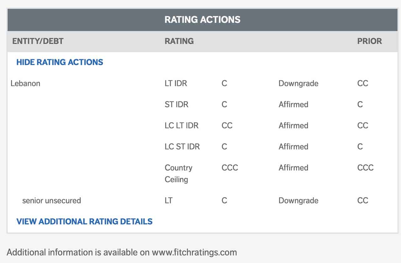 Fitch Ratings dégrade à C, les obligations internationales libanaises