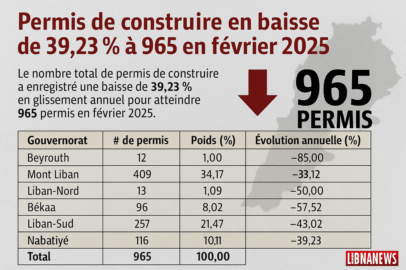 Le Liban a enregistré une chute de 39,23 % du nombre de permis de construire à fin février 2025, atteignant seulement 965 autorisations. Toutes les régions du pays sont touchées, avec une baisse particulièrement marquée à Beyrouth (-85 %). La situation économique et l’insécurité croissante depuis l’élargissement du conflit expliquent cette tendance alarmante. La surface autorisée à la construction reste stable, signe d’une résilience relative des projets les plus solides.