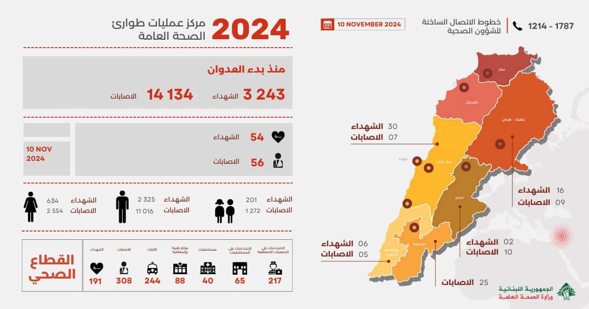 Le ministère de la Santé publique libanais a publié un rapport actualisé concernant les victimes des hostilités en cours, montrant un bilan humain alarmant. Depuis le début des affrontements, le Liban a enregistré 3 243 morts et 14 134 blessés, un chiffre qui ne cesse d’augmenter au fil des jours. Ce bilan inclut les dernières victimes du 10 novembre 2024, où 54 décès et 56 blessés supplémentaires ont été recensés.