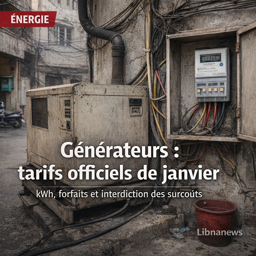 Le Ministère de l’Énergie et des Eaux publie les tarifs officiels des générateurs privés pour janvier 2026. Le kWh est fixé à 28 355 LL en zones urbaines et 31 190 LL en zones rurales, avec des forfaits selon l’ampérage. Le ministère rappelle l’obligation des compteurs et interdit tout surcoût illégal.