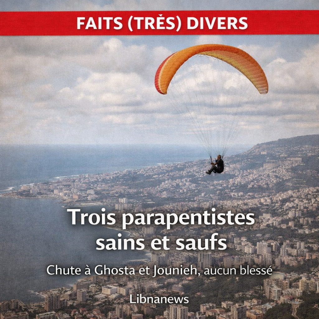 Trois parapentistes ont chuté lors d’un entraînement entre Ghosta et Jounieh, samedi 24 janvier 2026. Deux ont atterri à Ein Raqa et un autre au cœur de Jounieh. La Défense civile confirme qu’ils sont indemnes, sans hospitalisation. Les autorités rappellent d’éviter le parapente par vents forts ou mauvais temps.