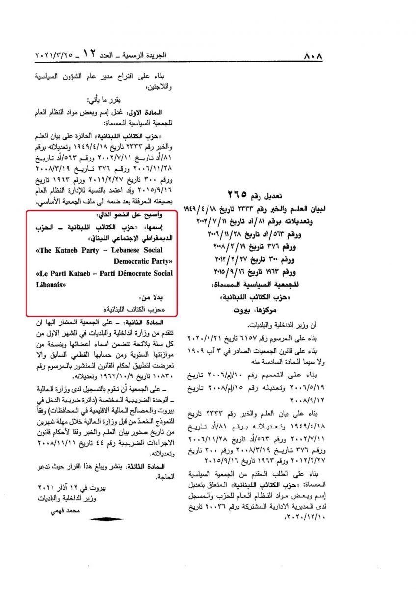 Le 26 mars 2021, le chef des Kataëb, Samy Gemayel, a annoncé que les Kataëb deviennent désormais « Le Parti Kataëb – Parti démocrate social...