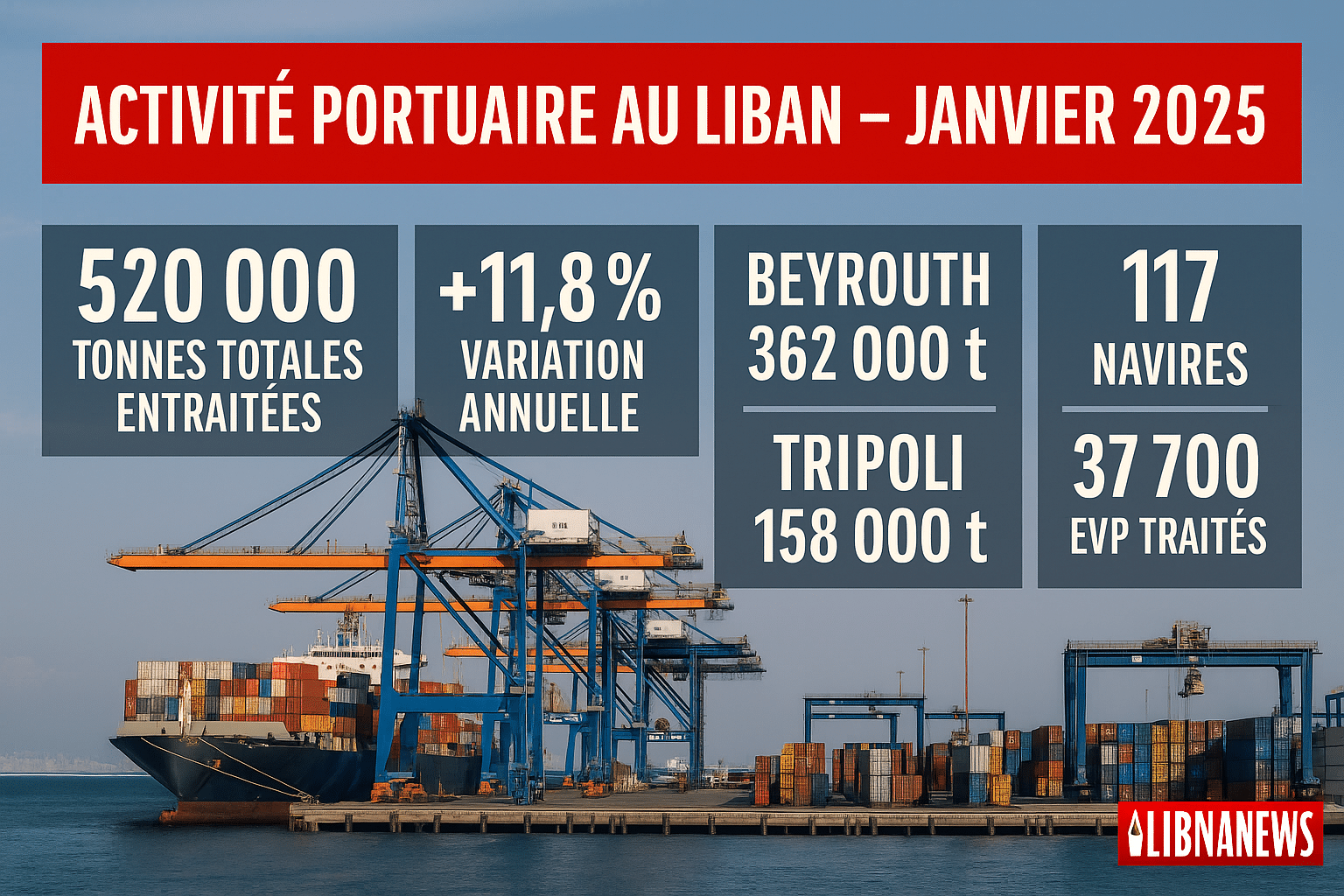 En janvier 2025, les ports de Beyrouth et Tripoli ont traité 520 000 tonnes de marchandises, soit une hausse de 11,8 % par rapport à janvier 2024. Le nombre total de navires est passé de 105 à 117. Beyrouth a traité 69,6 % du trafic, Tripoli 30,4 %. La majorité des flux concerne des importations. Les conteneurs EVP ont progressé dans les deux ports. Tripoli poursuit son expansion grâce à de nouveaux investissements logistiques.