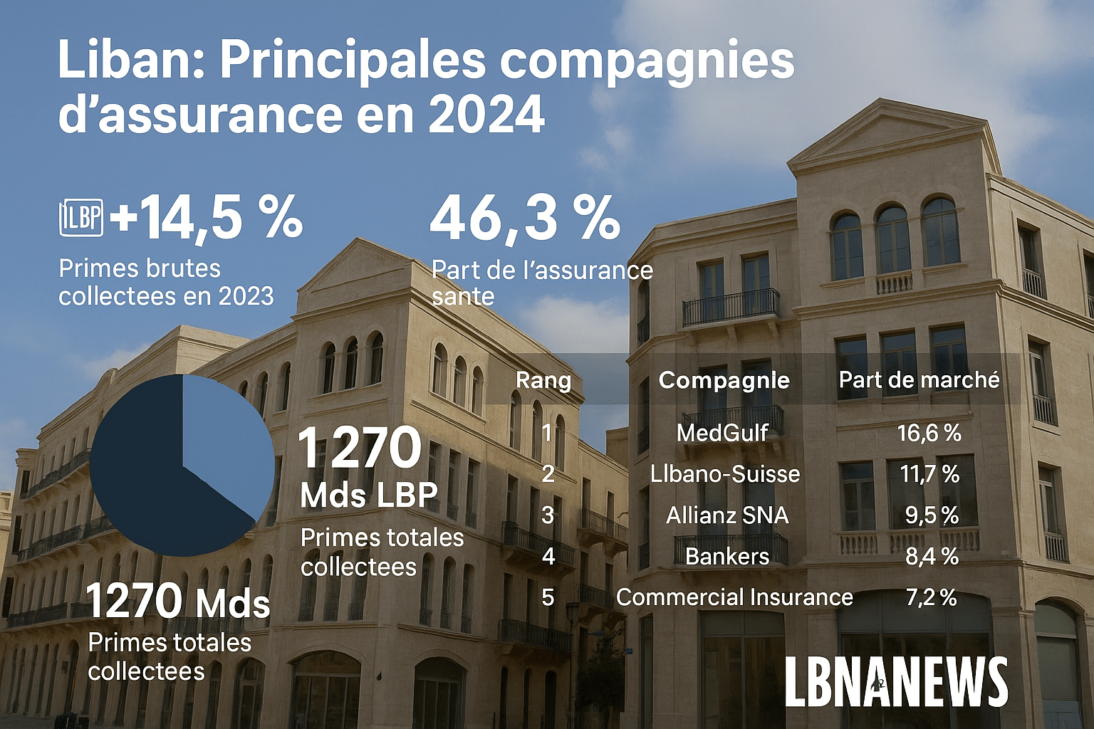 En 2023, les compagnies d’assurance au Liban ont collecté 1 270,3 milliards LBP de primes, soit une hausse de 14,5 % par rapport à 2022. Le marché est dominé par la branche santé, qui représente 46,3 % du total. MedGulf reste leader avec 210,4 milliards LBP. L’assurance incendie enregistre la plus forte croissance relative. La dollarisation croissante des contrats et les pressions inflationnistes influencent la dynamique sectorielle.