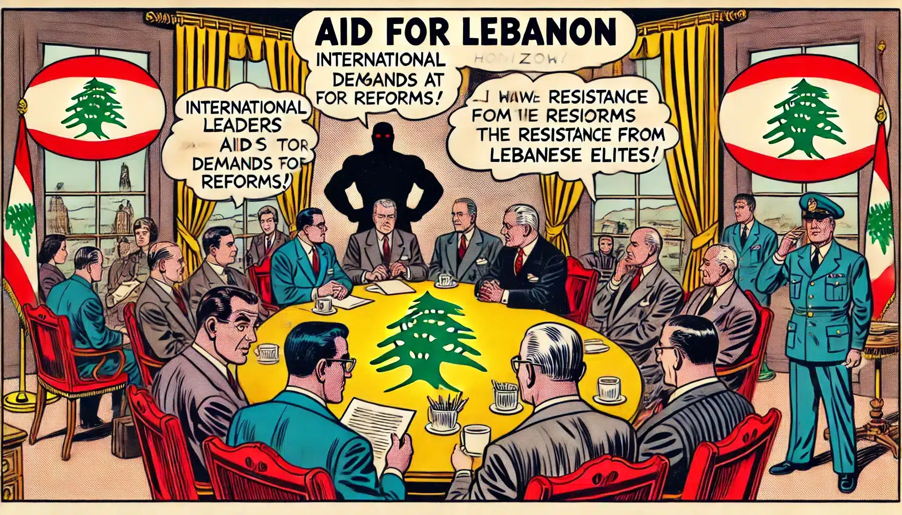 L'aide internationale destinée à la reconstruction du Liban après le conflit reste conditionnée à des réformes majeures que les élites politiques et bancaires continuent de refuser. Tandis que les puissances mondiales, comme la France et les États-Unis, insistent sur la transparence et la restructuration, le secteur bancaire gèle les fonds, et l'économie informelle devient une solution temporaire pour une population à bout de souffle. Le manque de réformes structurelles et la corruption persistante menacent de prolonger l’effondrement économique du Liban, malgré les promesses d’investissements étrangers conditionnés à un climat de confiance renouvelé.