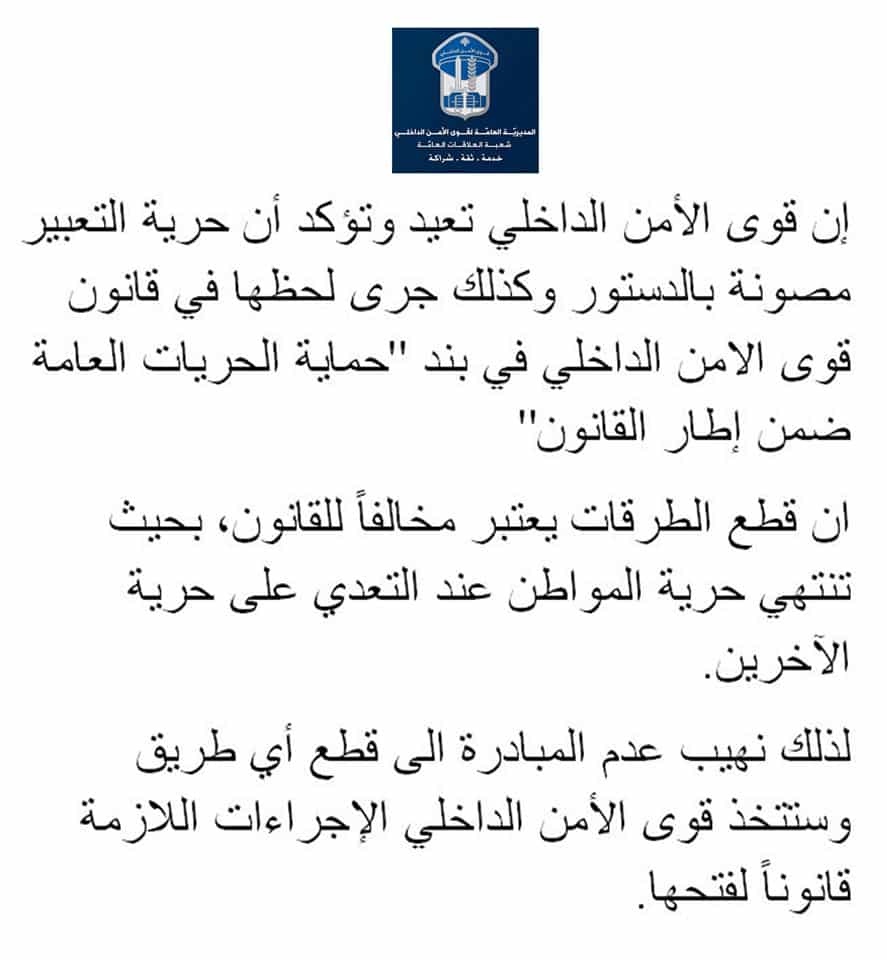 Les Forces de Sécurité Intérieure (FSI) ont mis en garde contre tout blocage des routes libanaises, alors que des manifestants se sont rassemblés à...