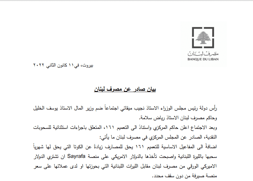 According to this amendment, the Bank of Lebanon will allow the purchase of dollars that it will provide against Lebanese pounds at the price of the Sayrafa electronic platform without a specific ceiling and this while the value of the Lebanese pound has deteriorated sharply in recent days. , breaking its declining records day after day against the greenback.
