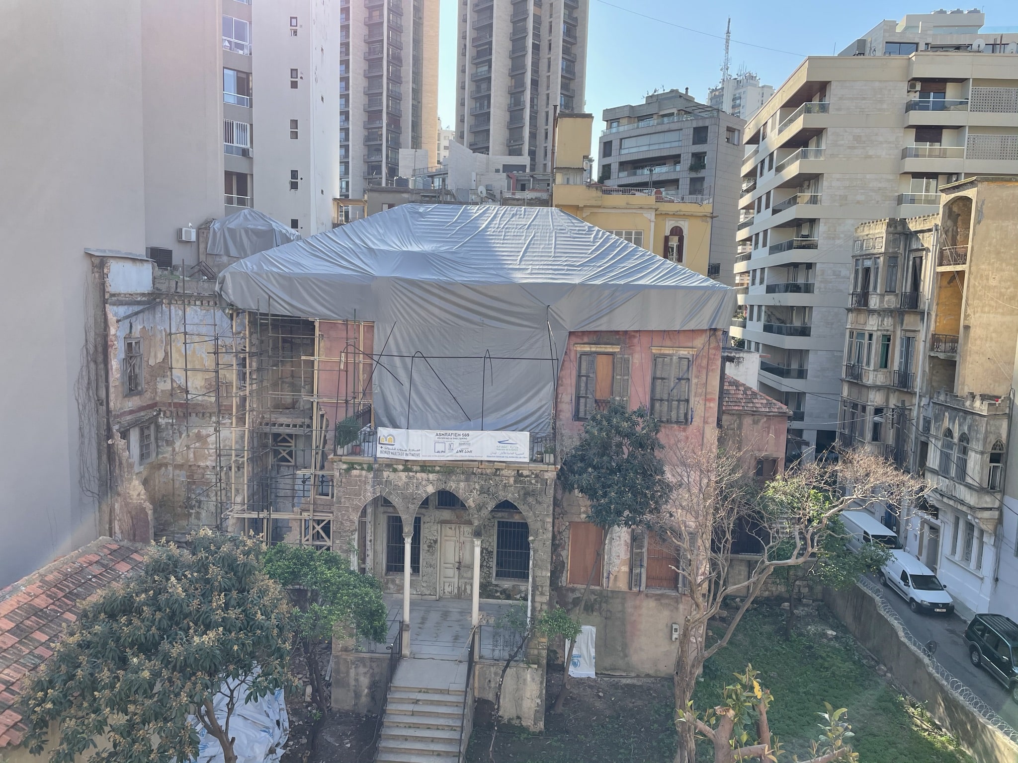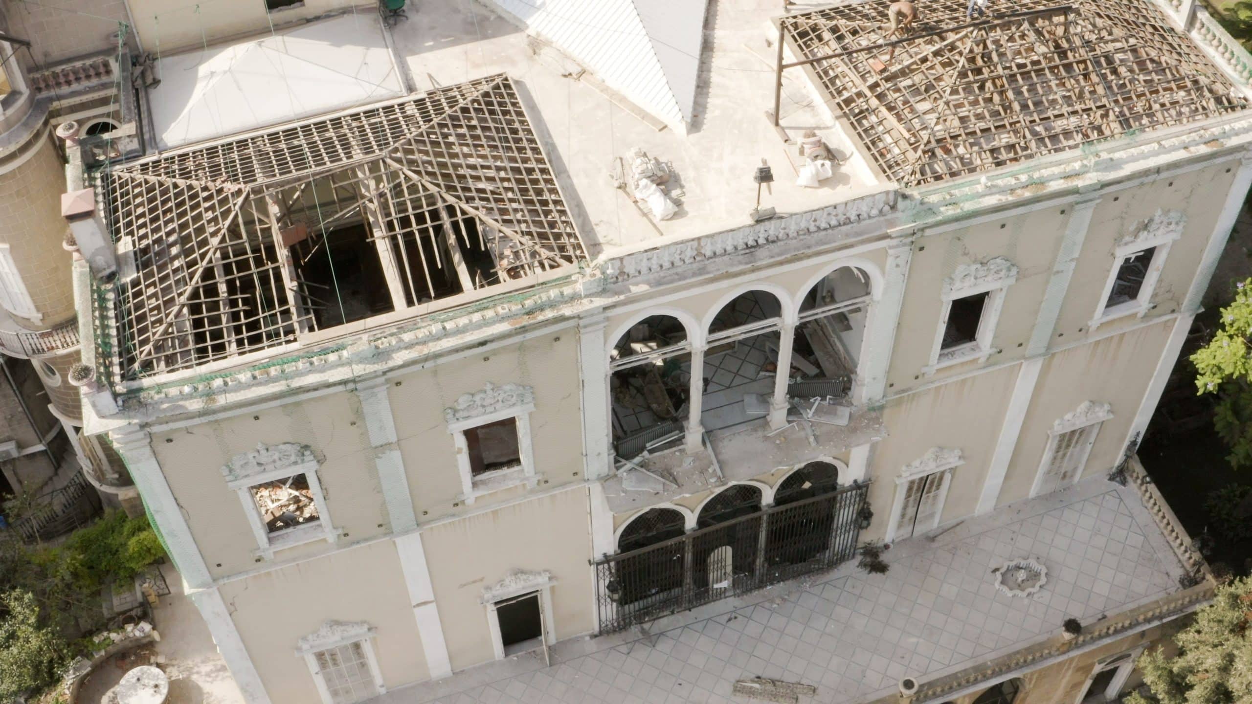 Parmi les bâtiments historiques stabilisés avec le soutien d’ALIPH, figure le Palais Sursock, réputé pour son architecture ottomane représentative des maisons patriciennes du XIXème siècle, ses arts décoratifs et ses œuvres d’art uniques, et qui, situé à seulement 500 mètres de l’explosion, a été particulièrement endommagé. Le projet, mis en œuvre par la Fondation nationale du patrimoine, en partenariat avec l’École Supérieure des Affaires (ESA), a consisté à installer une couverture temporaire du toit et des fenêtres, et à étayer la façade. En bas de la rue Sursock, bordée de villas des 18ème et 19ème siècles, le toit et les fenêtres de la Villa Mokbel ont également été stabilisés avec le soutien d’ALIPH, et les débris enlevés afin de permettre la réalisation d’un projet plus global de réhabilitation.
