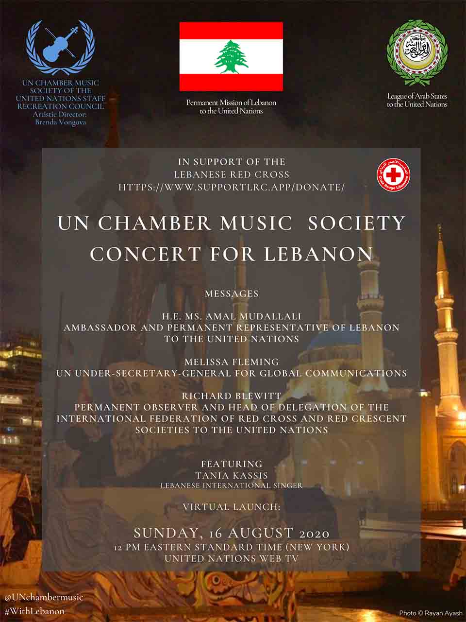 Sending solidarity and support to Lebanon and its people in the face of the unprecedented explosion, the UN Chamber Music Society of the United Nations Staff Recreation Council (UNCMS) will present a virtual concert in support of Lebanon’s ongoing relief and recovery efforts featuring Lebanese International Singer Tania Kassis this Sunday, 16 August 2020 at 7pm (Beirut Time) on the United Nations WEB TV: http://webtv.un.org/
