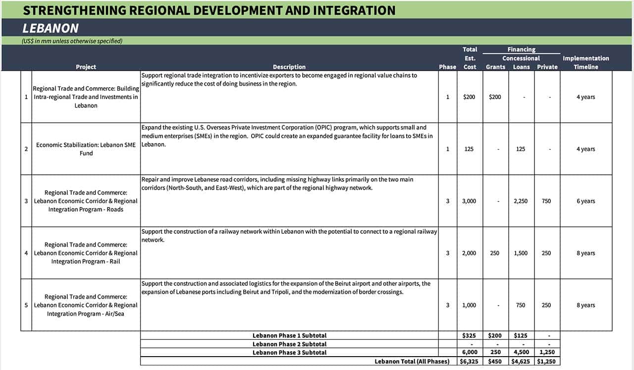 Pour le Liban, le programme américain promet 6 milliards 325 millions de dollars, soit très peu en comparaison que ce que ce pays a subi en raison du conflit israélo-arabe, de la présence des palestiniens au Liban ou encore même par rapport aux biens de ressortissants libanais, comme de nombreux terrains dans le Nord d’Israël, spoliés par l’état hébreu dont l’estimation basse serait de plus de 250 milliards de dollars selon certaines études faites par les ONG.