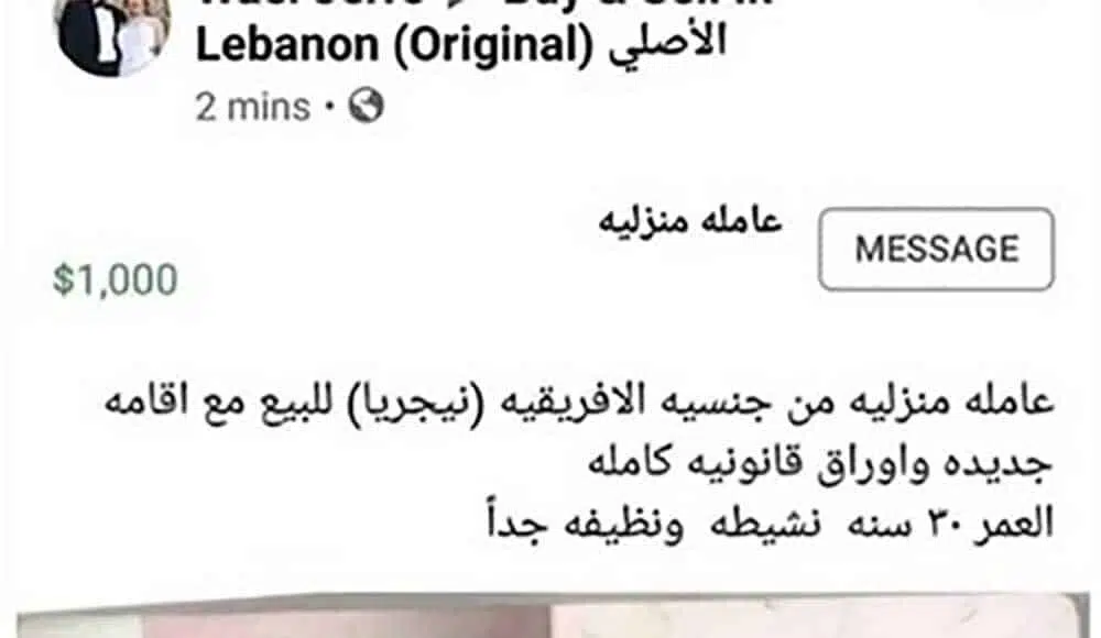 Ce dernier identifié comme Wael Jerro, avait publié cette annonce, aujourd’hui effacée, accompagnée par le passeport de la femme, sur le groupe Facebook Buy & Sell in Lebanon, précisant qu’elle avait 30 ans et qu’elle était disponible pour 1000 USD, provoquant une vague d’indignation.