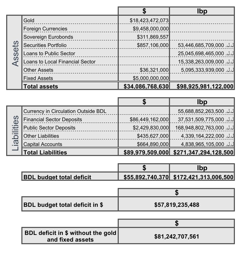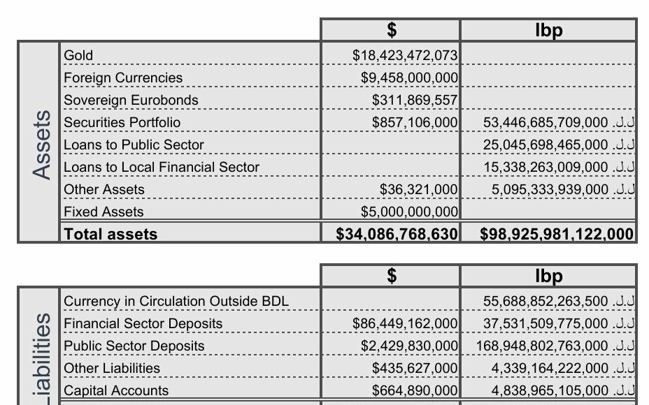 Le bilan de la Banque du Liban montre que la banque centrale libanaise a un endettement important prenant en compte un changement de parité qui passe de 15 000 LL/USD au taux réel. La dette de la banque est ainsi égale au total des actifs de la banque. Le déficit de la banque est également important.