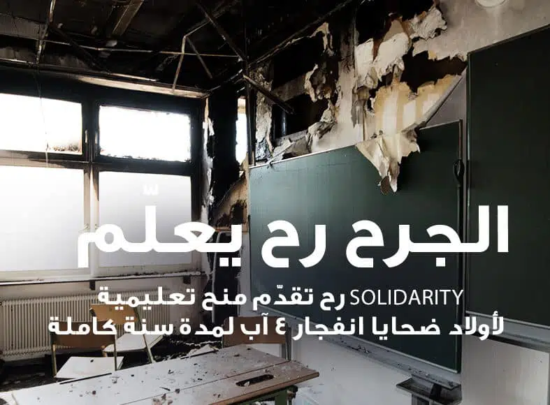 Un an après la douloureuse journée du 4 août qui a secouée le port de Beyrouth et suite à ses répercussions tragiques sur la vie des citoyens et de la cité, SOLIDARITY lance sa nouvelle initiative qui permettra à tous les enfants des victimes de l’explosion du 4 août et aux personnes gravement blessées avec un handicap de bénéficier des bourses scolaires et/ou universitaires ainsi qu’à un membre de la famille dans le cas où la victime n’a pas d’enfants.