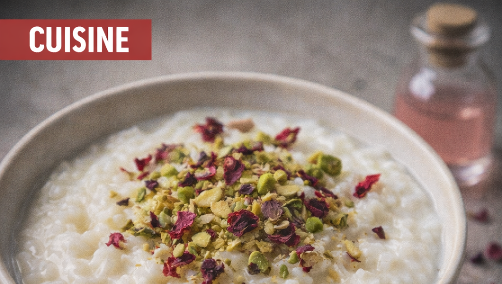 Les garnitures complètent le plat : des pistaches concassées pour un croquant vert vif, ou de la cannelle en poudre pour une chaleur épicée. Dans certaines versions, des amandes grillées ou des pétales de rose séchés sont saupoudrés, enrichissant visuellement et gustativement le dessert. Ces éléments, bien que secondaires, transforment un simple pudding en un mets raffiné.