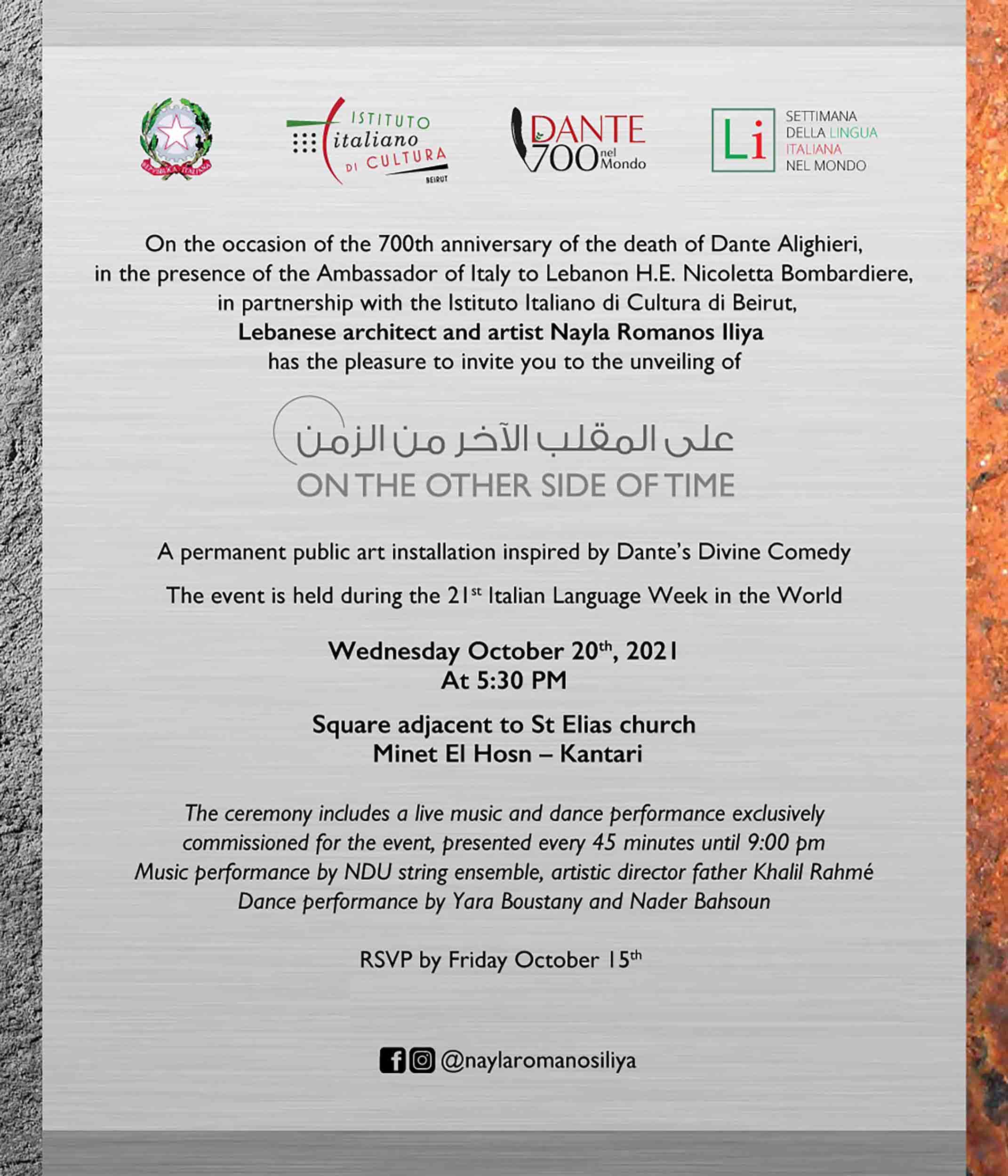 | A permanent public art installation inspired by Dante’s Divine Comedy The event is held during the 21st Italian Language Week in the World Wednesday October 20th, 2021 At 5:30 PM Square adjacent to St Elias church Minet El Hosn – Kantari The ceremony includes a live music and dance performance exclusively commissioned for the event, presented every 45 minutes until 9:00 pm. Music performance by NDU string ensemble, artistic director father Khalil Rahmé Dance performance by Yara Boustany and Nader Bahsoun RSVP by Friday October 15th joumana@mirrosme.com |