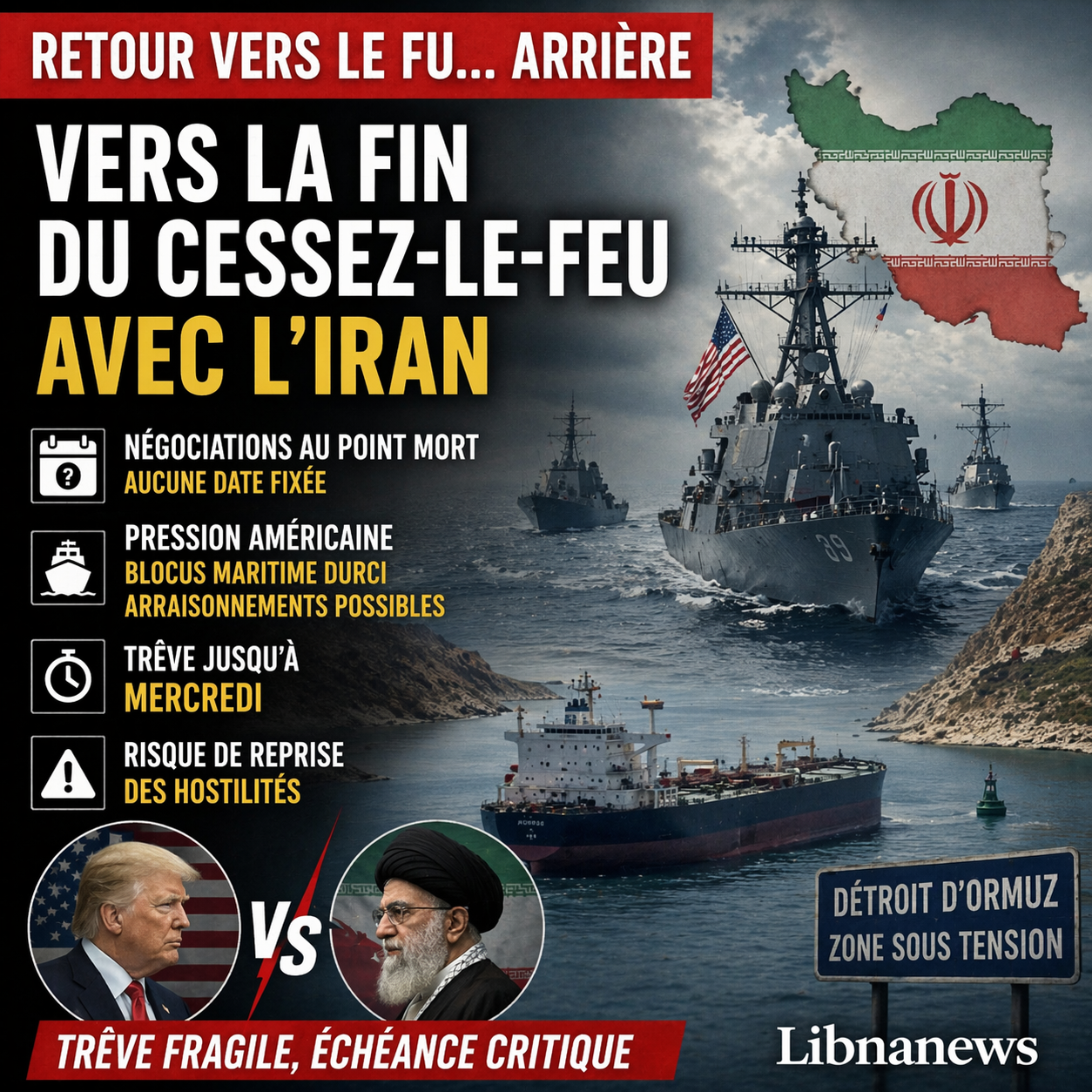 La situation se résume donc ainsi. Le cessez-le-feu approche de son terme sans second round programmé. L’Iran et le Pakistan disent qu’aucune date n’est fixée. Les États-Unis maintiennent un discours optimiste, mais préparent ou laissent filtrer des mesures de coercition supplémentaires en mer. Le détroit d’Ormuz reste un espace de perturbation. Et Donald Trump lui-même prévient que sans accord, les combats pourraient reprendre dès mercredi.