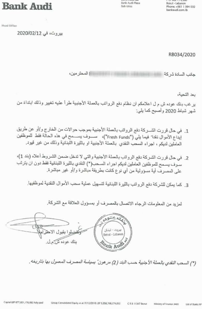 Fait que ne peut qu’inquiéter hier, une circulaire de la Banque Audi qui circulait sur les réseaux sociaux, indiquait que désormais, les salaires, précédemment versés en dollar américain, seraient désormais versés en Livres Libanaises, sauf si l’employeur faisait parvenir les – désormais – précieuses devises depuis l’étranger.