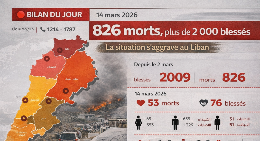 Lebanon crossed a new threshold in the ongoing war on Saturday, 14 March. According to the daily report of the Health Emergency Operations Centre of the Ministry of Public Health, the total number of deaths since 2 March now reaches826, while2,009 personswere injured. This update, relayed in the afternoon by the National Information Agency and confirmed by the Ministry’s official infographic, shows a rapid and continuous worsening of the human cost of the Israeli offensive on the country.